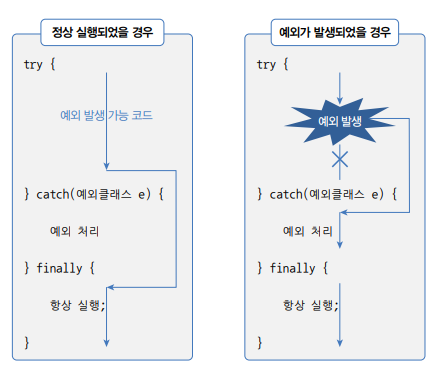예외 처리 코드는 예외가 발생했을 때에 프로그램의 갑작스러운 종료를 막고 정상 실행을 유지할 수 있도록 처리하는 코드를 예외 처리 코드라고 한다. 예외 처리 코드는 try-catch-finally 블록으로 구성된다. try가 예외 없이 실행되면 catch 블록은 실행되지 않고, 예외가 실행되면 catch가 실행된다. 예외 여부와 상관없이 fianlly 블록이 실행된다. 심지어 try와 catch 안에서도 return문이 실행되도 finally는 무조건 실행된다.